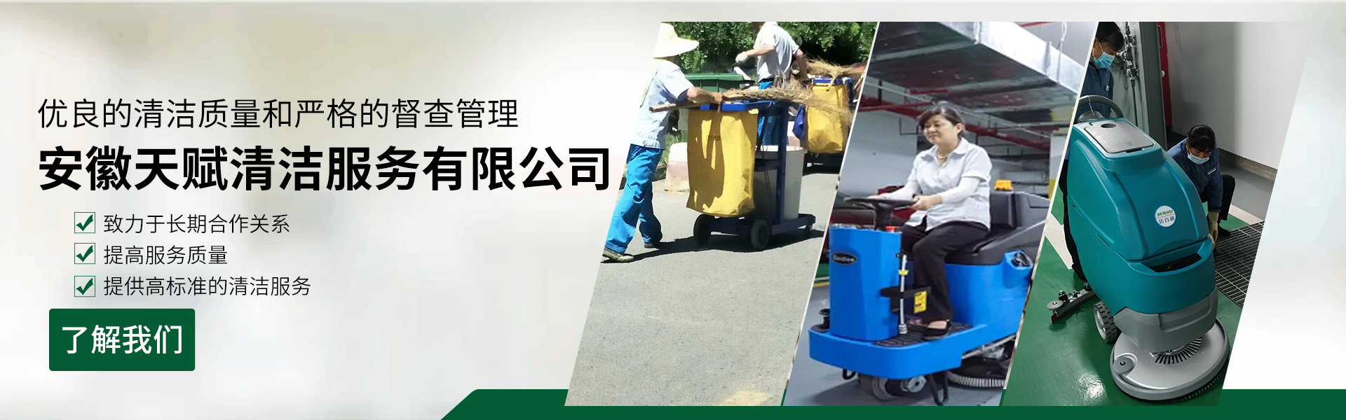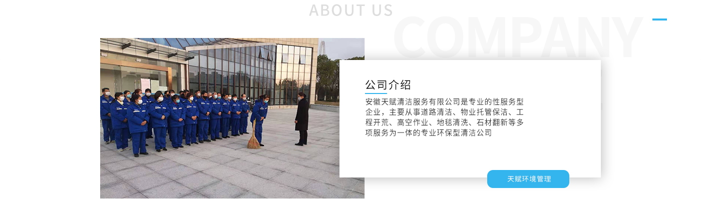 安徽天賦清潔服務(wù)有限公司是的服務(wù)型企業(yè),主要從事道路清潔、物業(yè)托管保潔、工程開(kāi)荒、高空作業(yè)、地毯清洗、石材翻新等多項(xiàng)服務(wù)為一體的環(huán)保型清潔公司。公司管理機(jī)制完善,清潔作業(yè)經(jīng)驗(yàn)豐富,擁有技術(shù)力量,嚴(yán)格實(shí)行崗前培訓(xùn)—崗中督查—上崗在培訓(xùn)的員工管理措施,憑著優(yōu)良的清潔質(zhì)量和嚴(yán)格的督查管理,為眾多企事業(yè)單位、醫(yī)院、酒店、廠區(qū)商場(chǎng)、物業(yè)、道路、學(xué)校、公園等提供后勤清潔服務(wù)。在業(yè)內(nèi)擁有良好的口碑。工作人員,服務(wù)態(tài)度優(yōu),竭力為客戶提供好的保潔服務(wù)。安徽天賦清潔服務(wù)有限公司:致力于長(zhǎng)期合作關(guān)系,提高服務(wù)質(zhì)量,提供高標(biāo)準(zhǔn)的清潔服務(wù)。公司的經(jīng)營(yíng)理念:為營(yíng)造一個(gè)更清潔、亮麗的生活和工作環(huán)境而努力!“誠(chéng)信”是公司成功保證。“客戶至上,信譽(yù)為首”是公司宗旨。高標(biāo)準(zhǔn)提供服務(wù),維護(hù)客戶利益、形象,是我始終不渝的目標(biāo)。